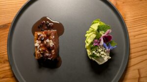 Uovo in camicia affogato su letto di cardi gobbi, fonduta di raschera delle valli Ormeasche e chips di topinambour. Qui le emozioni proseguono. Pietanza di golosità assoluta. A contrastare uovo e caseina la fibra di squisiti cardi spadellati e le patatine fritte.Da bis.