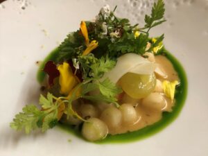 Piatto della serata , per la qualità della cappasanta, appena scottata e mantenuta bella turgida, per l’ottimo gioco di consistenze e la persistenza della preparazione. Ottimo l’abbinamento liquido, dallo sfumato sentore di miele. Piatto che, in tutta onestà, sarebbe risultato normale in molti altri posti di rango. Qui compitino svolto, ma nulla che faccia gridare al miracolo.