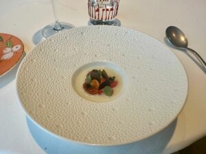 Prima ho avuto l’amuse bouche con l’aperitivo ( i cetrioli), poi è arrivata singolarmente la ciotola con quello che mi è stato presentato come “salsifis japonais et soja” .