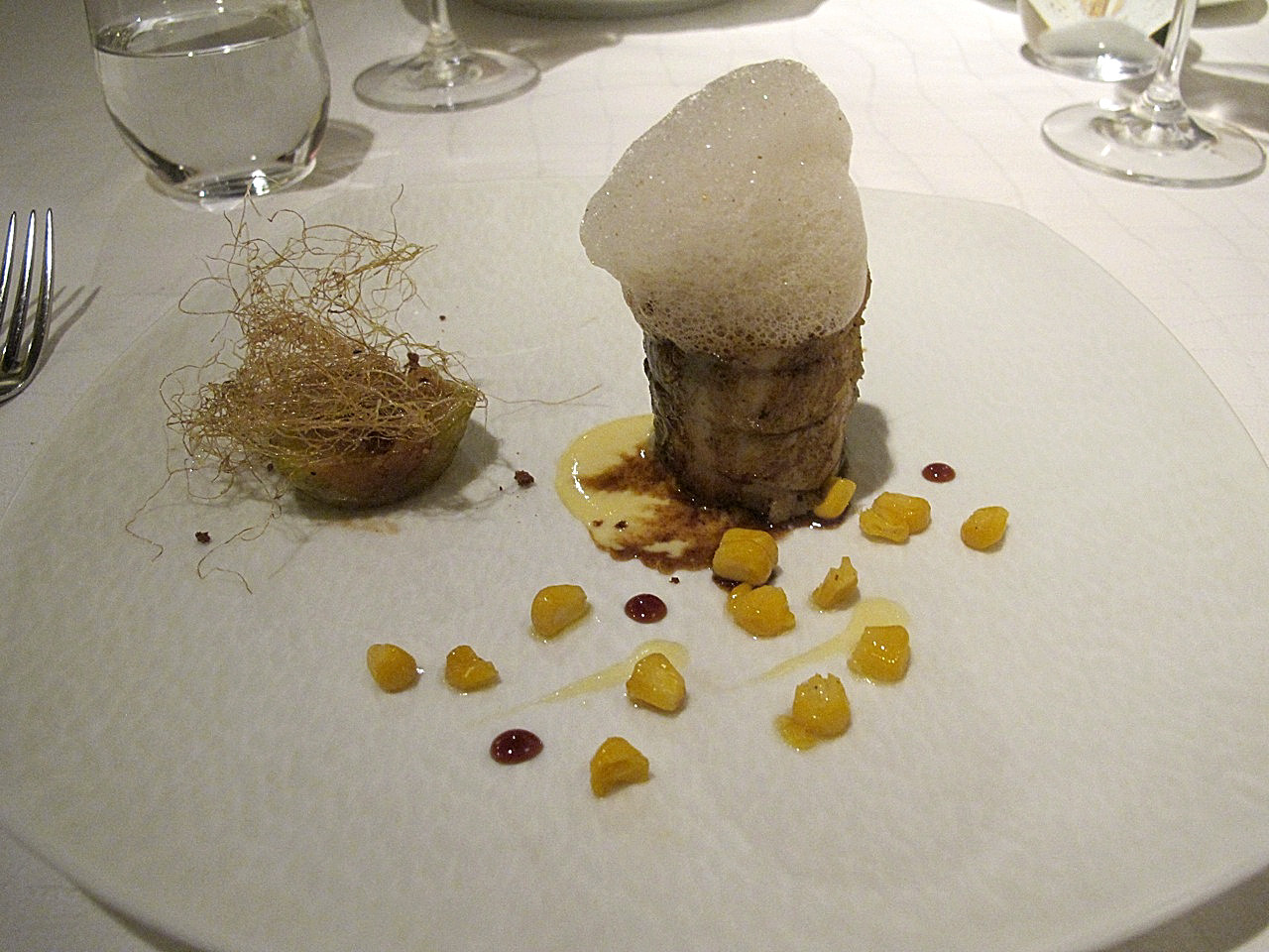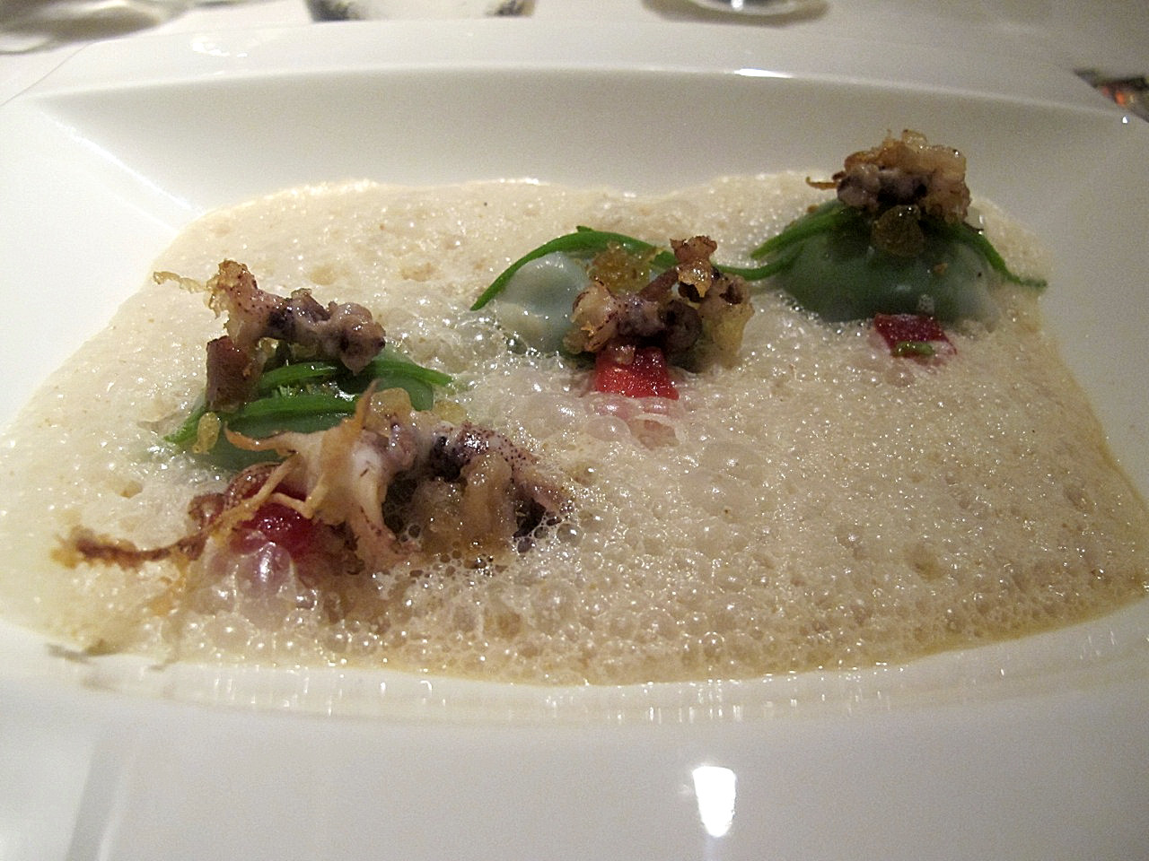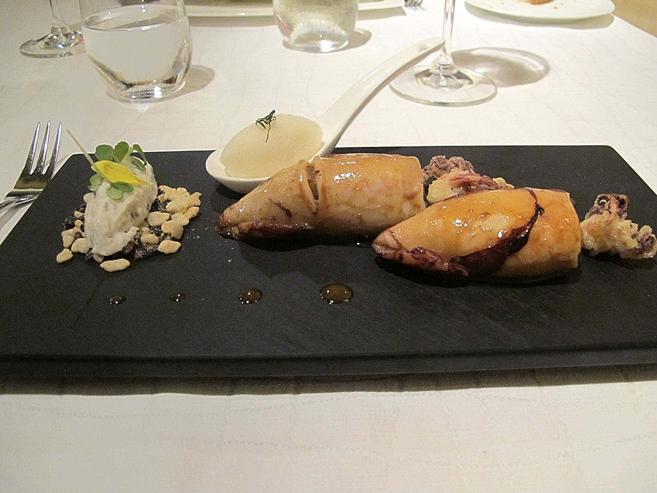 è un piatto non riuscito. Un gran peccato perché tecnicamente il dim sum è realizzato in maniera eccezionale, il gusto della materia prima è ottimo, ma l’accompagnamento del the nero è in quantità esagerata (viene spontaneo prendere una cucchiaiata del brodo e della spuma che accompagnano i dim-sum e la sensazione così tannica non è piacevole). L’altro provato , il calamaro ripieno con crema di riso al cocco, è un viaggio allez-retour in oriente molto più equilibrato, che fa tornare alla memoria uno dei motivi per cui abbiamo apprezzato Anthony Genovese