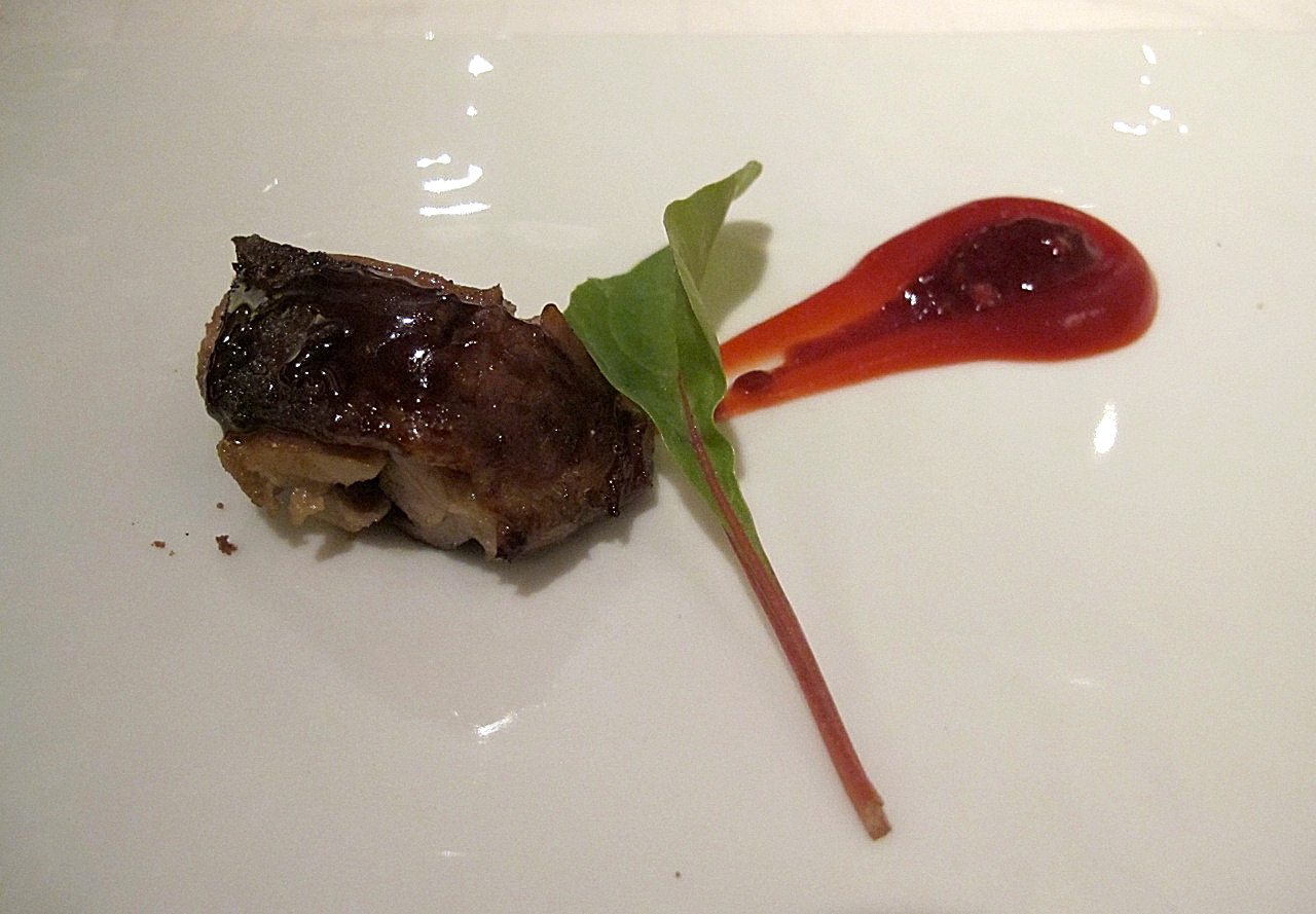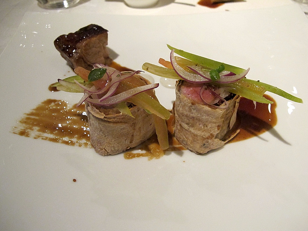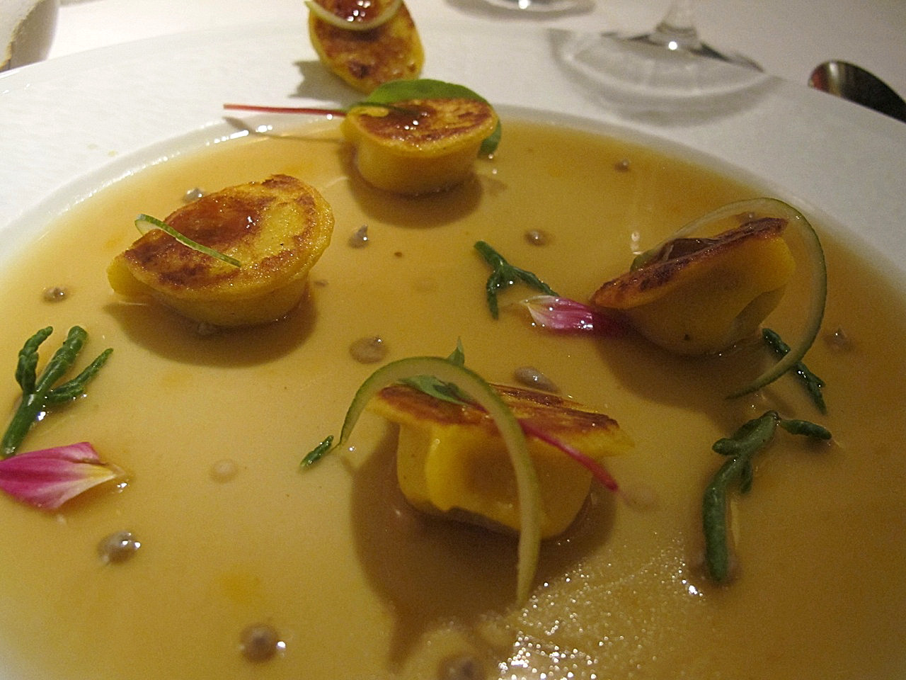 è un piatto non riuscito. Un gran peccato perché tecnicamente il dim sum è realizzato in maniera eccezionale, il gusto della materia prima è ottimo, ma l’accompagnamento del the nero è in quantità esagerata (viene spontaneo prendere una cucchiaiata del brodo e della spuma che accompagnano i dim-sum e la sensazione così tannica non è piacevole). L’altro provato , il calamaro ripieno con crema di riso al cocco, è un viaggio allez-retour in oriente molto più equilibrato, che fa tornare alla memoria uno dei motivi per cui abbiamo apprezzato Anthony Genovese