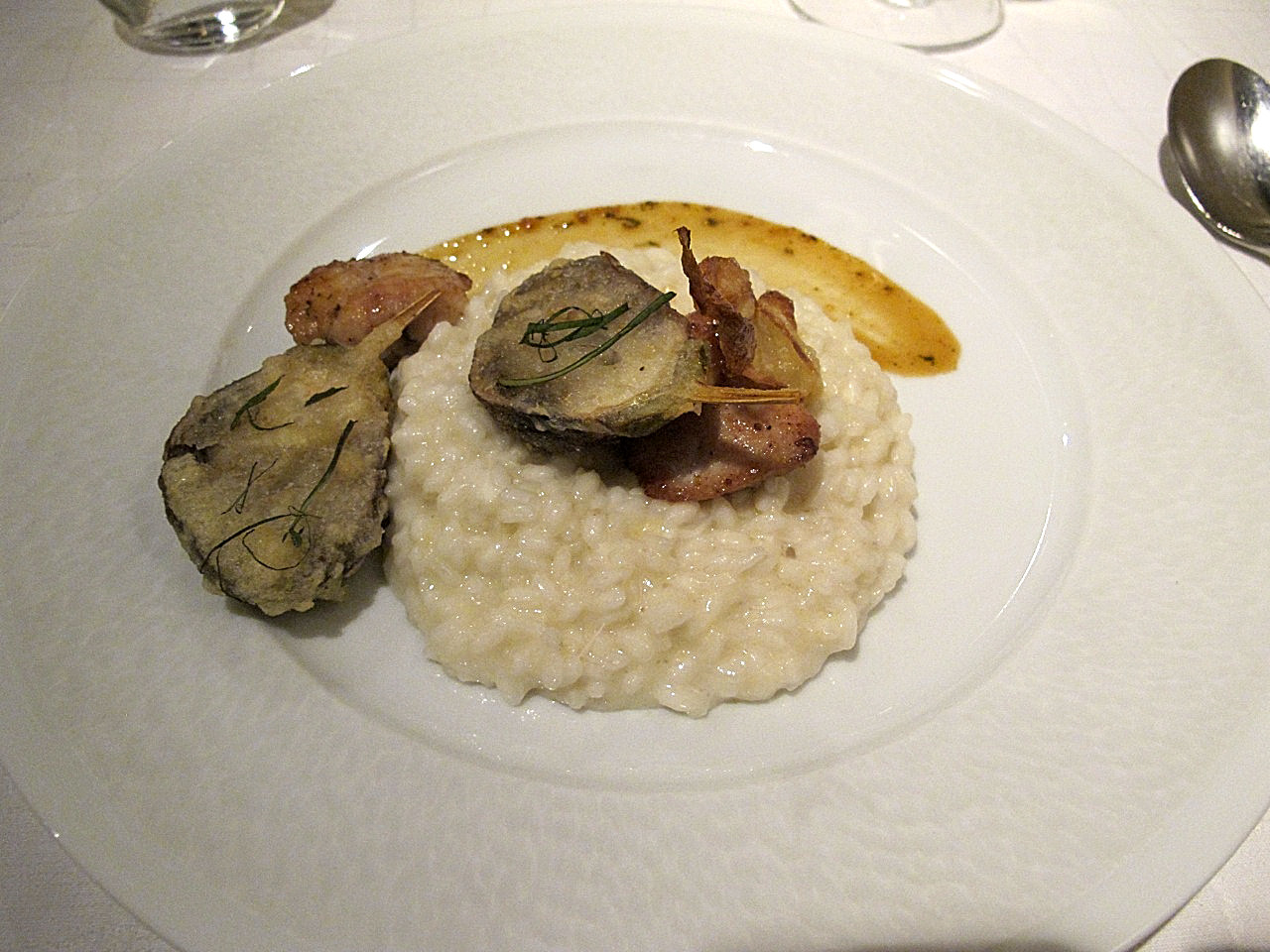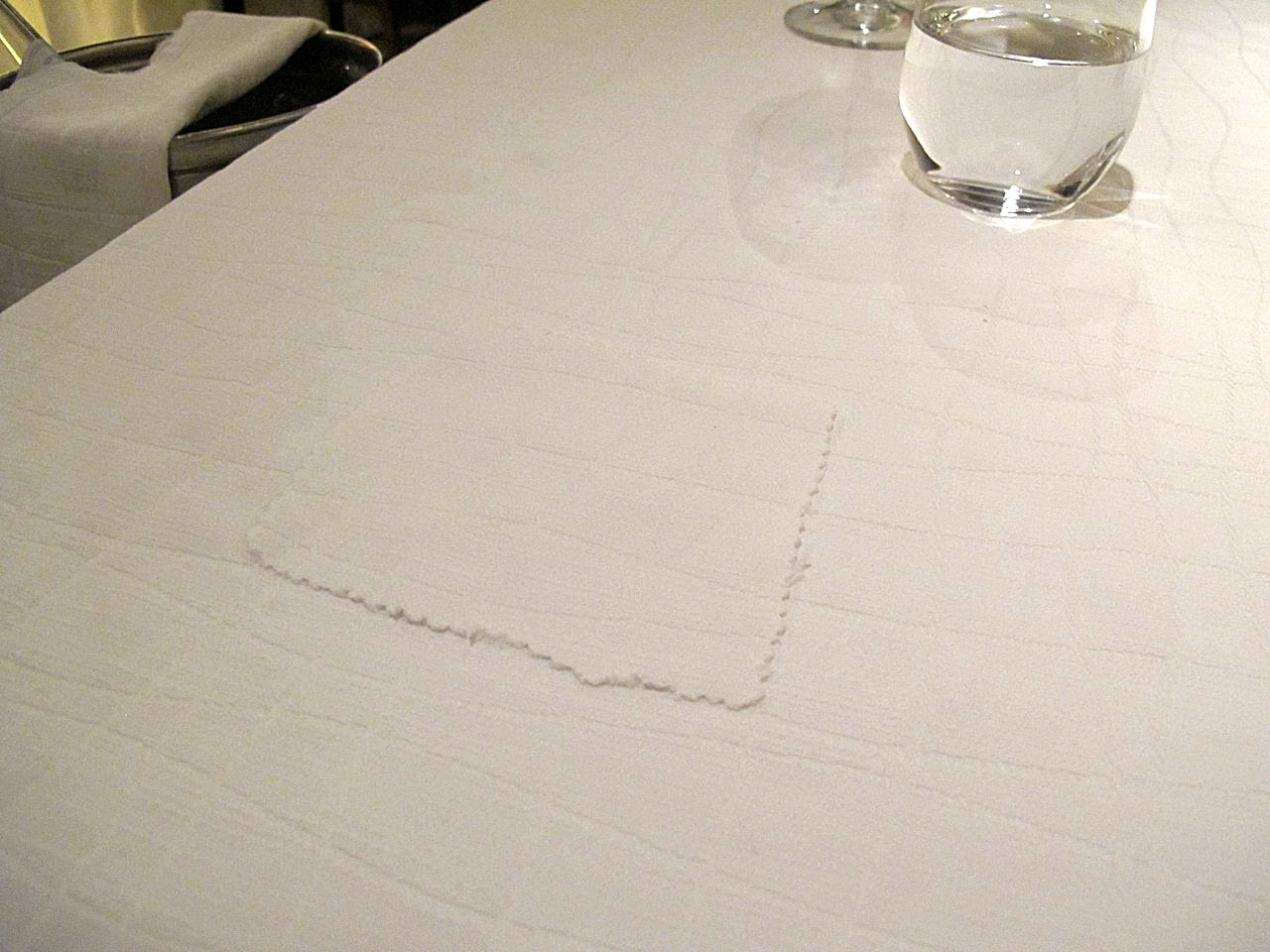 La sala, che risente un po’ di questi vari “strati” di storia, con la giustapposizione degli elementi d’arredo iniziali e successivi, è comunque confortevole e accogliente; il servizio, come si diceva, è ormai da grande tavola, ma ha mantenuto quel garbo e quella simpatia genuina che lo caratterizzavano in passato (eccellente l’innesto del nuovo sommelier; il rimpianto, anche mio, per la comunque bravissima Kana Oia può essere solo dovuto a preferenze di genere :wink:).
