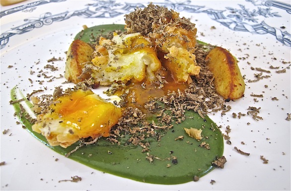 Si prosegue con i filetti di trota cotti a 70° con eccellente salsa di menta e finocchio, tuile di spinaci, salsa di lamponi, ananas disidratato con mandorle, già visto in precedenza, e il goloso uovo nero con patate e tartufo nero, salsa di strigoli e quenelle