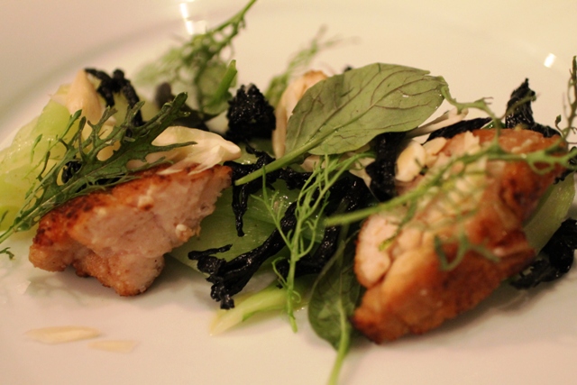 Animelle, trombetta dei morti ed erbe di campo. Qui si nota tutta la tecnica del cuoco. Le animelle, prima cotte sottovuoto restano morbidissime e dal sapore intenso, poi vengono impanate e fritte. A regola d’arte. Risultato croccantissimo e frittura asciutta. Bravi.