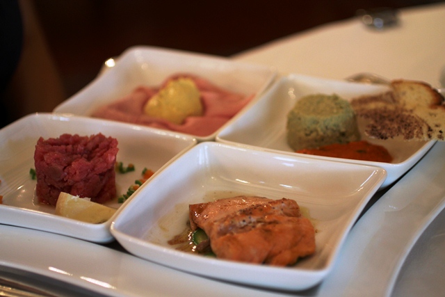 Degustazione dei quattro antipasti serviti nel “Quadro della Tradizione”: Carne cruda di vitello battuta al coltello (straordinaria qualità); Vitello tonnato; flan di verdure e salmerino scottato.