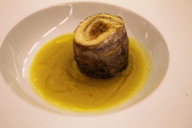 ”Turbante” di spatola ripieno di mollica di pane ai profumi di Sicilia, servito su una crema di finocchio e zafferano. Buona materia prima ma poco convincente la crema di finocchio. L’avremmo preferita meno grassa.
