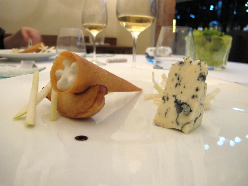 Pera Guyot all’aceto, Fourme d’Ambert in cono croccante (e al naturale), un omaggio a Passard da sempre proposto.
