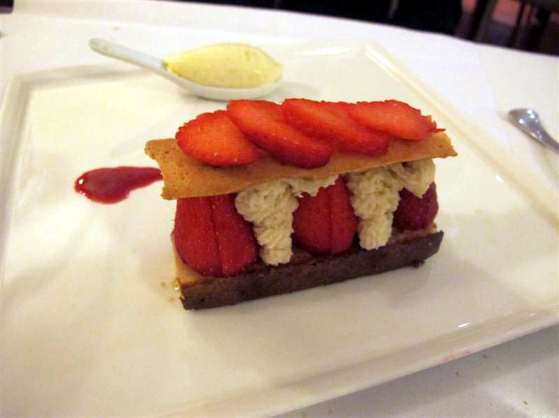 Tutti i piatti sono ben realizzati, come i classici “oeufs en meurette” e “jambon persillé”, entrambi ricchi e saporosi seguendo la tradizione ma straordinariamente leggeri e digeribili. Tra i piatti principali da segnalare il carré d’agnello, di ottima qualità, accompagnato da un buon puré di patate. Ottima anche la “Cocotte