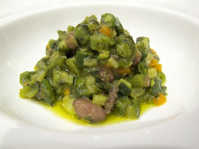 Onesto minestrone su pesto di guanciale croccante, patate e pan grattato.