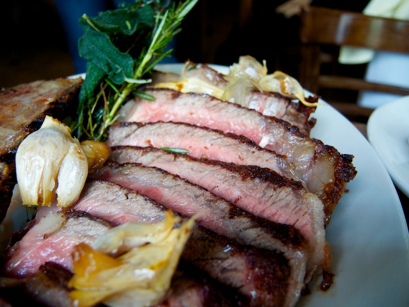 La succulenta e ottima Grass Fed Bone In Rib Eye, patate fingerling e peperoncini shishito.