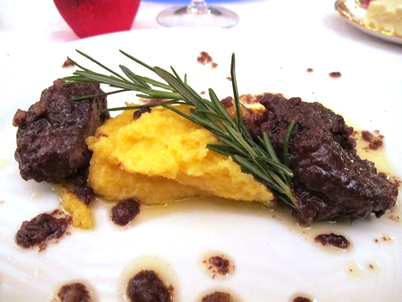 Faraona del Vicariato di Quistello con uva, arancia, mostarda di mele campanine, melograno e menta. Un piatto rinascimentale che avrebbe dovuto essere forse il più rappresentativo della cucina di Tamani. Purtroppo la faraona non era all’altezza delle aspettative ed il piatto si è dimostrato il meno riuscito del pranzo. Peccato.