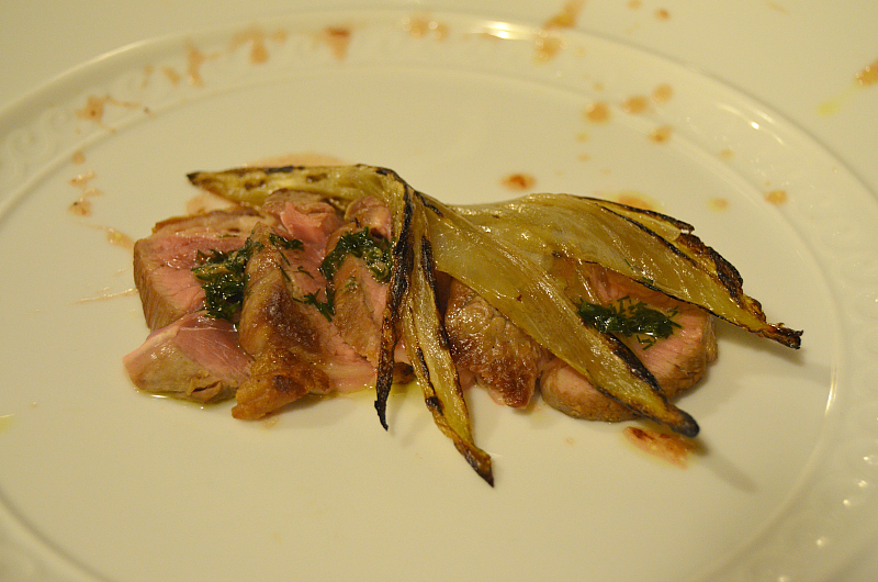Agnello alla piastra con aneto e acciughe, indivia croccante e olio al cranberry (mirtillo rosso americano). Compito eseguito egregiamente, elementi amari e sapidi in evidenza e di contrappunto alla dolcezza delle carni.