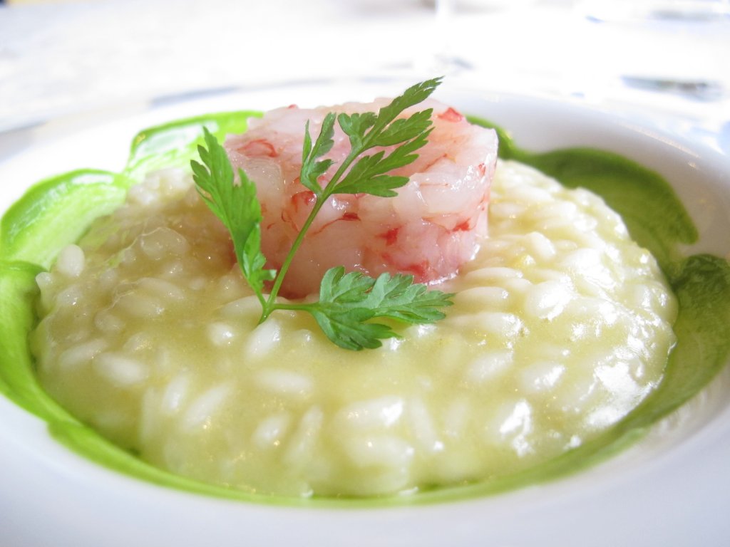 Ottimo Risotto mantecato al limone con gambero crudo e salsa di pesto gentile.