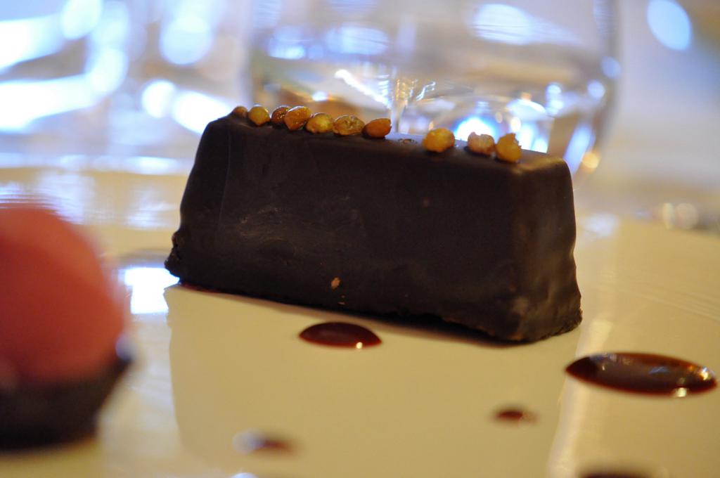Bauletto di tre consistenze al cioccolato, panna cotta al mosto, sorbetto ai frutti rossi, gocce di amarena e cuccia (grano). La pasticcera è Carlotta Occhipinti: la ragazza sa il fatto suo. Abbiamo assaggiato anche altri dessert, tutti di altissimo livello. Un altro piccolo tassello al posto giusto nel mosaico del Duomo.