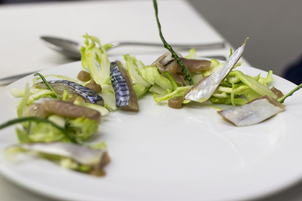 Grunt: Prosciutto di cinghiale maison con erbe amare invernali e mela verde.
