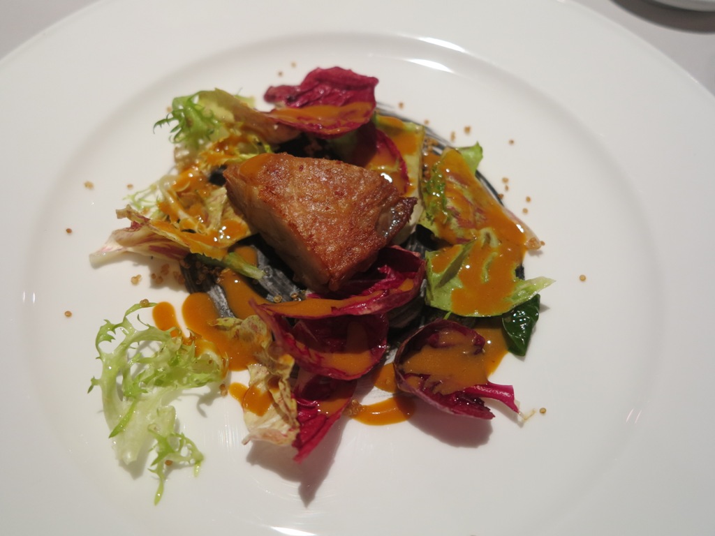 Insalata di lingue d’anatra, fragole e fegato grasso arrosto, dov’è ben misurata l’acidità della fragola che nulla toglie alla golosità complessiva del piatto.