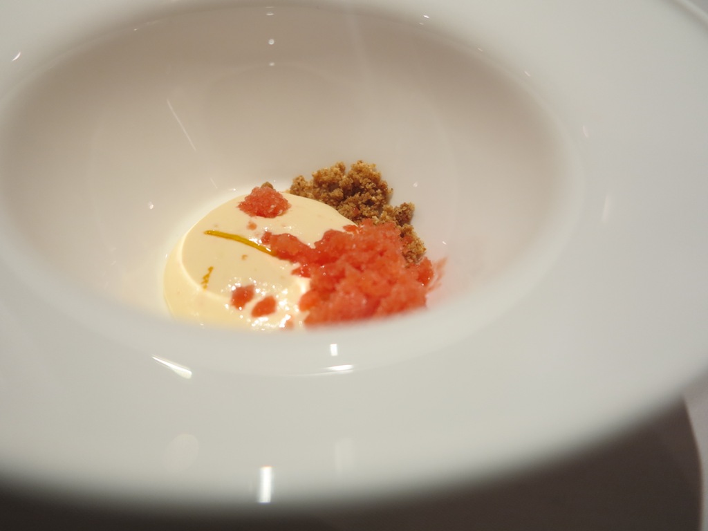 Refresh&acid; ananas al maraschino, crumble al lime, spuma di yogurt e granita di sedano caramellato. Evidente la ricorsività nell’utilizzo dello sbriciolato per donare croccantezza e masticabilità ai dessert, pur in contesti assai diversi e, precisiamo, tutti di buon livello.