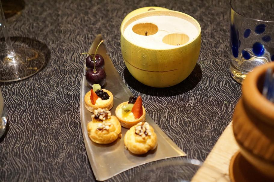 Piccola pasticceria: i contenitori, come molte delle stoviglie, sono creazioni dello chef.