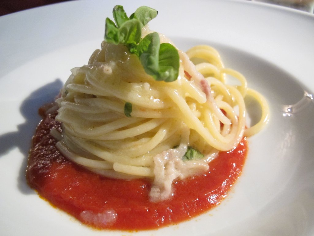Spaghetti Vicidomini, cipollotto nocerino e basilico su pomodoro San Marzano e guanciale di Nero.