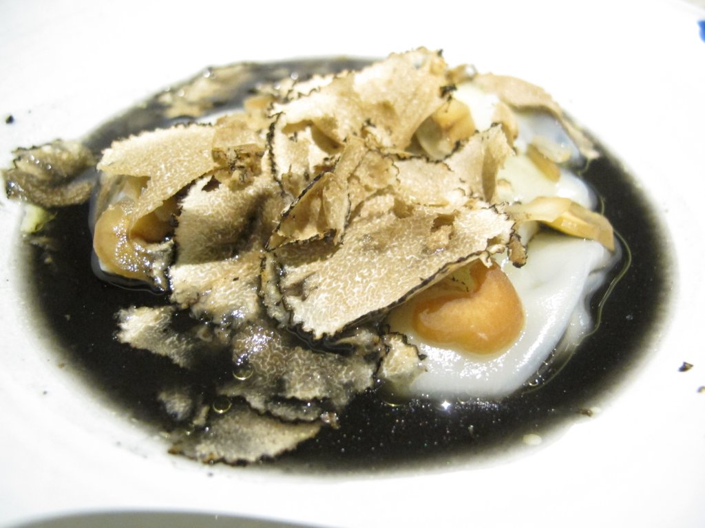 Il Giappone: alla base brodo di carbone e Katsuobushi, gnocco di seppia con purea acida di patate all’interno, tartufo nero e nocciole di Cuneo. Acidità.