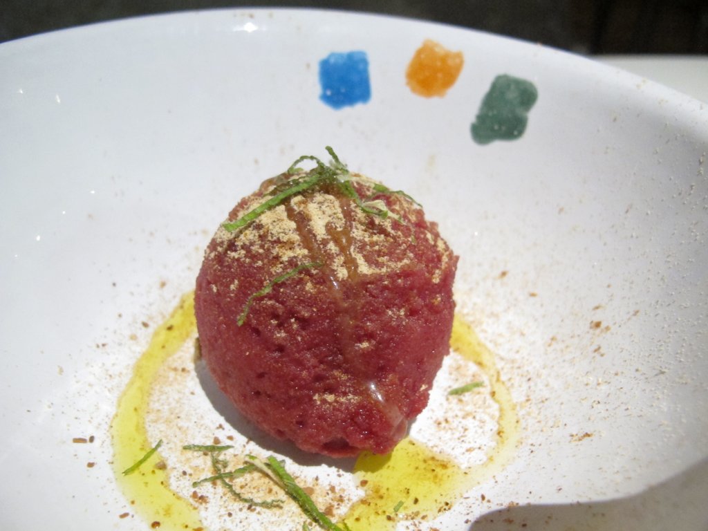 Pre Dessert: sorbetto Gin&Tonic alla rapa rossa con polvere di lucuma e menta variegata. Freschezza.