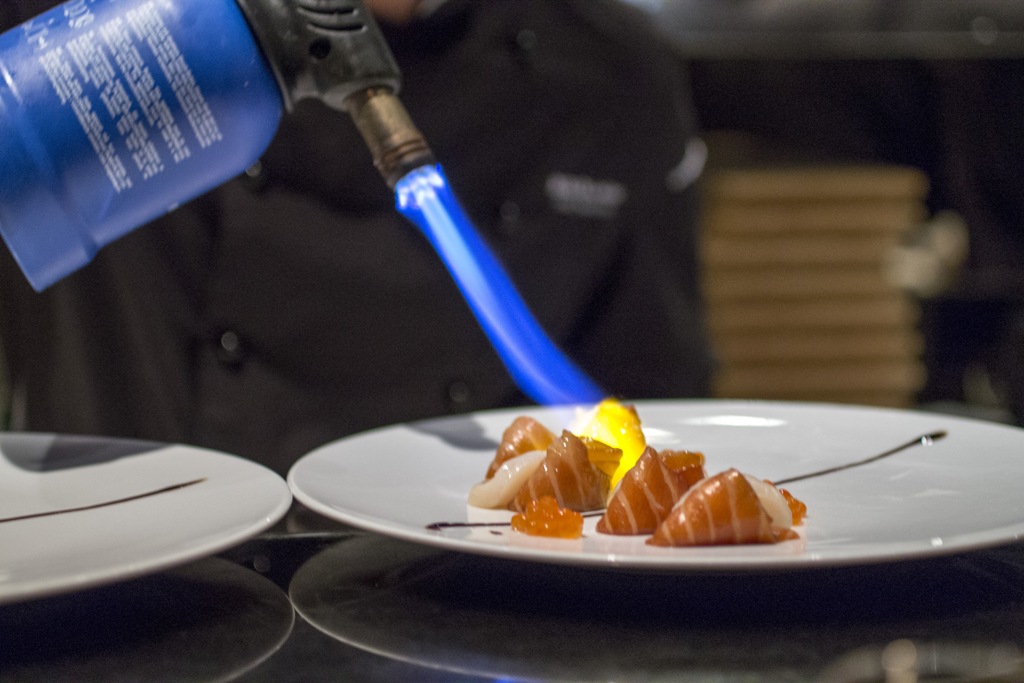 Ventresca di ricciola appena scottata con il cannello. Classico boccone da Re.