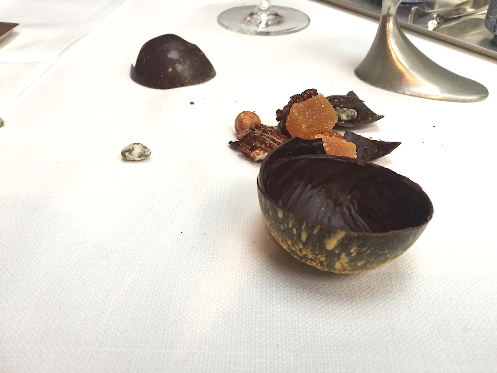 Una tecnica (les Mijotés Modernes) che è già un grande classico dello chef: cotture lente in crosta o su gusci di noci o ancora su castagne, la tradizione classica trasposta negli anni 2000.