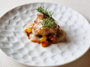 Il Rombo con maionese alle erbe e lattuga marinata (omaggio al “Reale”) è un piatto notevolissimo, degno del tristellato abruzzese.