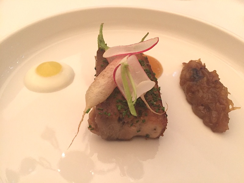 Ne citiamo uno, la splendida pancetta “snacké” con yogurt e cipolla, che è un ricordo d’infanzia “rustico” ma delizioso (e torna in mente un altro “orso” della cucina contemporanea, quel Matt Dhalgren che al Matsalen osa come Decoret piatti ruvidi in menù elegantissimi, così come il maestro Passard, forse esempio ben più conosciuto).