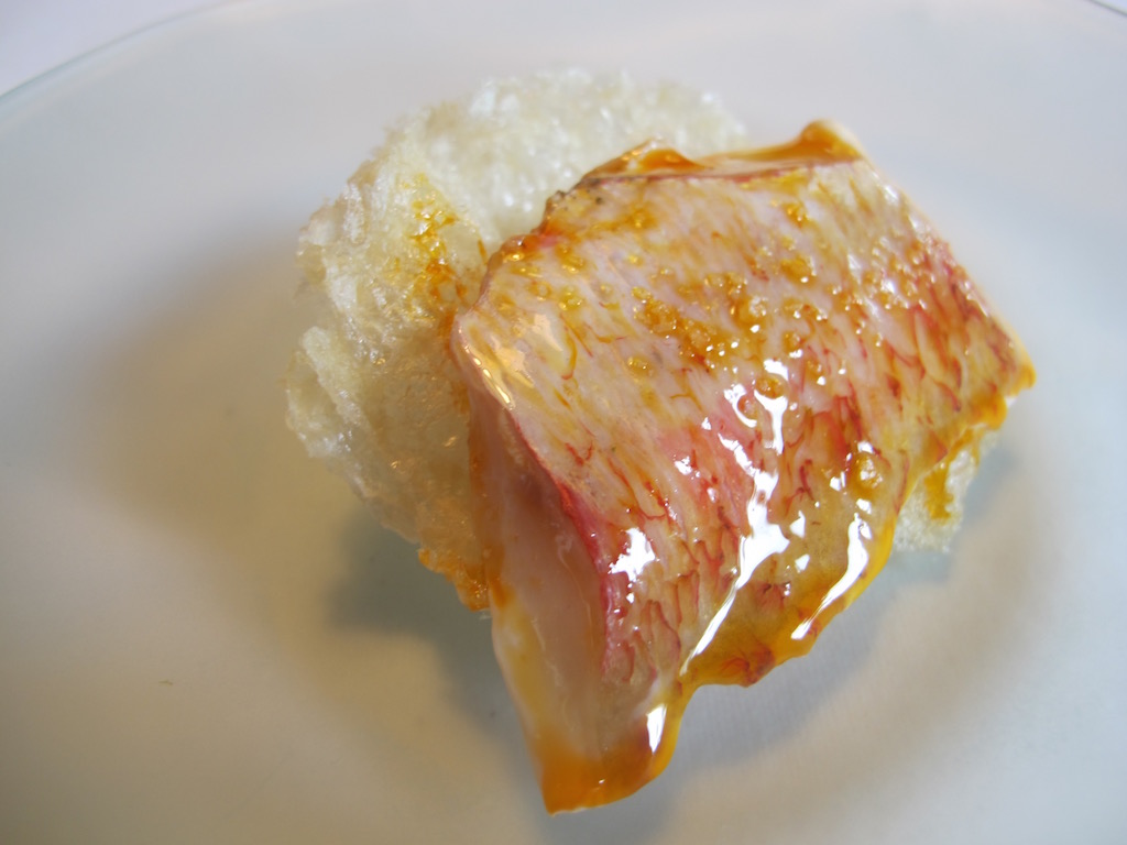 Insalata di granchio ghiacciata e uovo. Passaggio complessissimo. In bocca cambiano sia le consistenze che le temperature che da fredde e dure divengono piano piano tiepide e morbide. Incomprensibile e geniale.