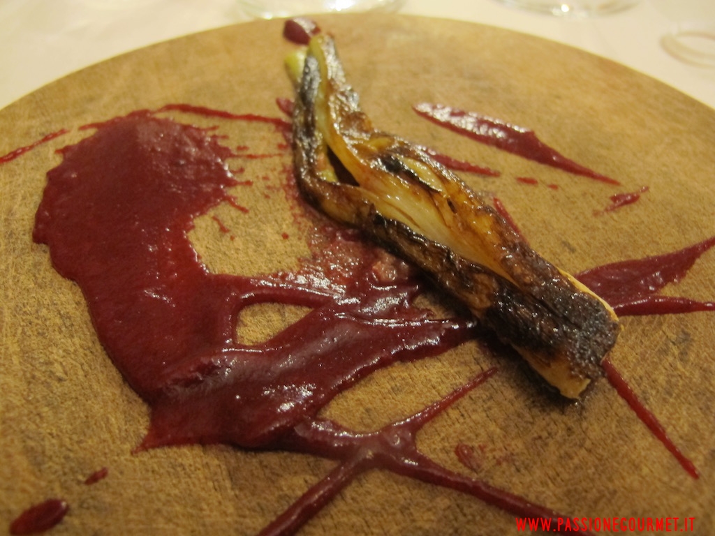 Cuore di lattuga, senape e pane sabbiato è la sintesi della vita della lattuga, che cresce a contatto con la terra, si concede con retrogusti quasi golosi tramite la sua succosità quando colta nel pieno della sua maturazione, per poi piano piano ossidarsi se non consumata a tempo debito. O come il cipollotto ripieno di prosciutto crudo, con salsa di rapa rossa al barbecue, che dona vitalità, attraverso la grassezza del prosciutto e l’avvolgenza terrosa della salsa, ad un cipollotto apparentemente privo di sensi a causa di un impiattamento dai tratti pulp.