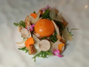 Così in questo perpetuo scambio culturale tra tradizione gastronomica transalpina e italiana c’è spazio per entrambe le anime, sia laddove presentate autonomamente sia in stimolanti dialoghi, marchi di fabbrica della casa. I toni salmastri e amaricanti di capesante appena scottate e arricchite da acqua di mare, il croccante di quinoa e sfere di Blu Curaçao, sorta di evocazione visiva e gustativa delle selvagge coste bretoni, di pulizia e potenza gustativa assai inusuali nel passato di questa tavola; la golosità quasi plateale di uno scampo con panatura di popcorn di cicciolo di maiale, gelatina di piedino e musetto di maiale, mayonnaise di dragoncello e olio di semi d’uva. Entusiasmante nella sua capacità di coniugare classicità e nuovi orizzonti prospettici la carbonara di ostriche, cui la sferzata iodica data dal mollusco riesce a conferire un linguaggio familiare e insieme spiazzante, ulteriormente valorizzato da un azzeccato abbinamento con un particolarissimo gin piemontese, preparato con infusione di capperi di Pantelleria ed essenze mediterranee.