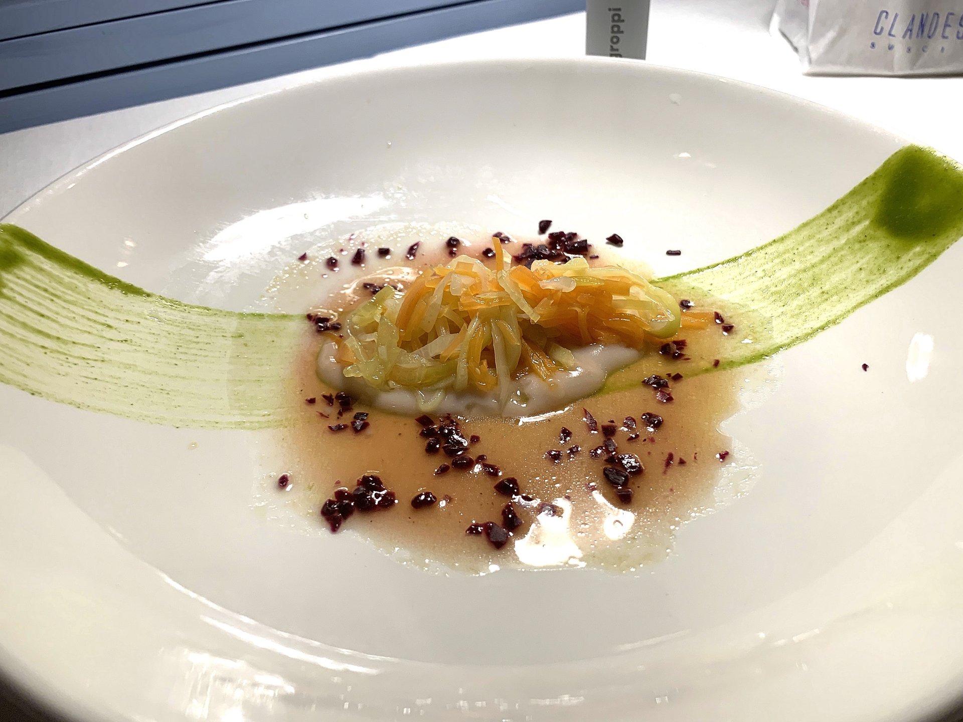 Soffio di Mare e soffio di terra. Spinosini al granchio reale, carote fermentate, zenzero