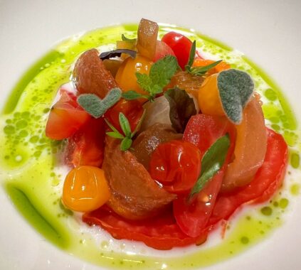 Anche il brunch rispecchia la casa, racconta di Massimo, di Lara e, ovviamente, di chi lo prepara in cucina. Gli ingredienti del territorio, in primis le verdure dell’orto curato da Lara, a due passi dal giardino in cui viene servito, e la cultura gastronomica del luogo vengono tutti interpretati dalla nebbia dell’affumicatore e dal forno a legna, governati con disinvoltura e perizia dalla canadese Jessica Roval che infila qua e là i propri ricordi (a 5 anni con papà faceva camping nel bosco e legno e fuoco dunque le sono congeniali) e gli spunti tratti della cucina del paese di origine, come si fa in una conversazione fluida e distesa.