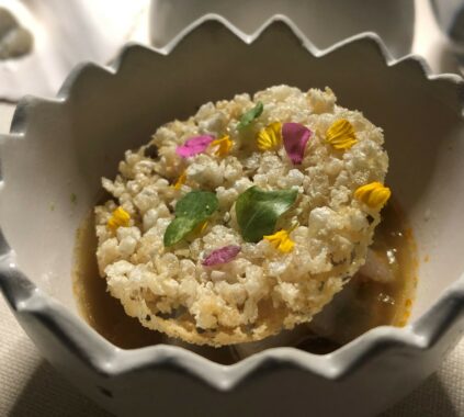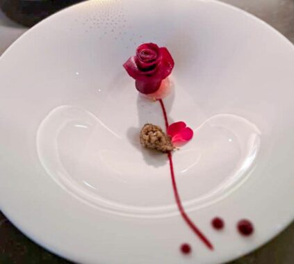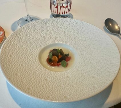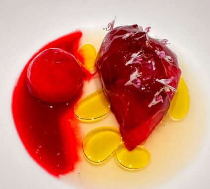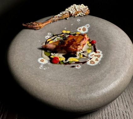 La tavola è apparecchiata con accurata semplicità, il servizio è di confortevole e confortante informalità senza rinunciare alla precisione; in generale, sull’approccio rilassato dell’insieme la dice lunga il titolo dato al percorso: “tòla dòlza”, un chiaro invito in famigliare dialetto modenese che suona come “take it easy”. Il menù scorre via sulla scia della pienezza dei sapori forgiati dal fumo dolce dell’affumicatore e dalla cottura a legna e sull’onda dell’armonia conviviale delle migliori domeniche in famiglia, quando in tavola arriva, per la gioia di tutti, una serie di sfizi da gustare uno dopo l’altro o anche da combinare in libertà, a cominciare dalla crème fraîche con ricotta di Rosola ed erba cipollina che dà sprint acidulo alla ghiotta focaccia o al pane-piada sofficione ed elastico e alleggerisce la pancia di maiale marinata nello sciroppo d’acero, fondente a puntino e, in bilico tra dolce e salato, amabilmente smoked.