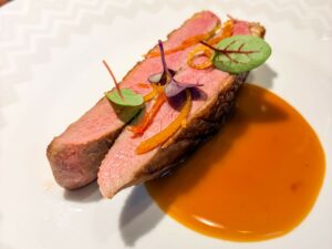Ottimi nella loro semplicità, i Salumi “home made” in apertura del pasto, morbida e profumatissima la Bresaola da abbinare ad un fresco drink a base di gin. Tra le portate principali, le più riuscite e interessanti sono quelle dove ci si discosta maggiormente dai canoni della cucina tradizionale, come il Carpaccio di cervo che trova un inusuale, ma azzeccato, contrappunto nel gambero rosso crudo e nell’acidità data dal frutto della passione. Millimetrica l’esecuzione dell’Uovo morbido cotto a bassa temperatura con crema di castagne.