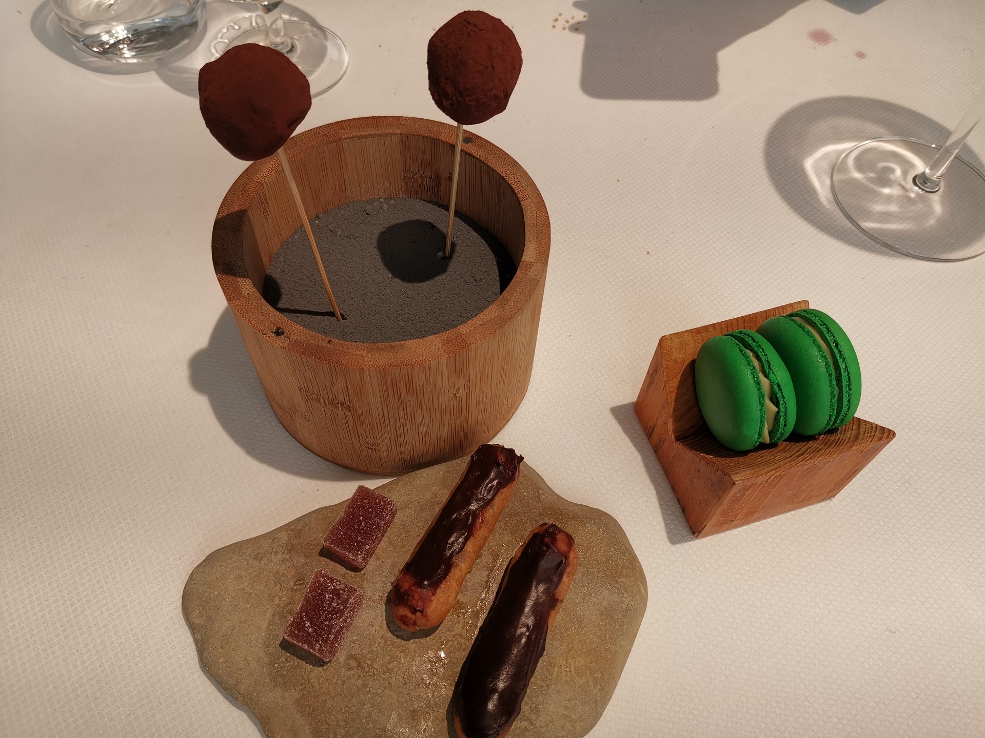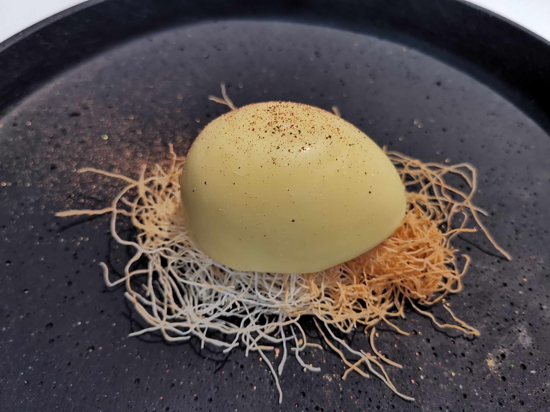 In chiusura lodevole anche l’uovo al cioccolato bianco, pasta kataifi, mango, polvere d’oro, con un bel gioco di consistenze tra la copertura al cioccolato, la farcitura acida al mango e la croccantezza della pasta kataifi.