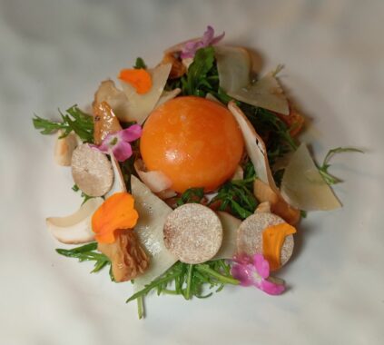 Il civet è un metodo di cottura particolarmente adatto alla selvaggina, che consiste nel cuocere la carne a fuoco lento in una salsa a base di vino, sangue, verdure e spezie. Leggi dal timbro sì speziato, ma non invadente e, in bocca, si avverte una consistenza piacevolmente setosa. Ancora, c’è un gioco serrato tra la componente acida della crema di nespole e quella aromatica del bitter. Di più, ci sono la dolcezza e la grassezza del fegato grasso, resa lieve perchè servito fresco, semplicemente salato, a dare morbidezza al piatto, sposandosi perfettamente alla magrezza della carne.
