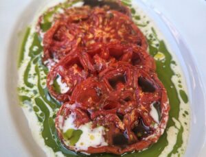 Un unico percorso degustazione, non esiste una carta fra cui scegliere, la totale assenza di carne, per focalizzarsi solo sul mondo vegetale e marino, con pesci e crostacei di grandissima qualità e verdure super fresche. Una evidente maestria nel cesellare i piatti che si presentano di grande impatto visivo e di indubbia eleganza: traslando il concetto dalla moda haute couture (sartorialità, manifattura di grande pregio, stoffe preziose), qui siamo indubbiamente nella haute cuisine. E difatti si rilevano influenze francesi nell’uso delle salse, ma parliamo comunque di una cucina che poggia le solide basi sulle materie prime nordiche che vengono decisamente nobilitate. Particolare la location, all’interno dello stadio di Copenhagen, una scelta all’inizio criticata, me che ha dato alla fine ragione ai due soci, tanto da citarla nel discorso effettuato durante la premiazione del 50 Best. Si percepisce, all’interno di questo microcosmo, un clima lavorativo di grande piacevolezza e armonia, sia in brigata, che lavora a vista sul locale, sia nel servizio, con una bella presenza di italiani sia in cucina che in sala. Un locale molto accogliente, con una sala che gira alla perfezione grazie a Mattia Spedicato e Giulia Caffiero, che portano tutto il loro calore mediterraneo e i loro sorrisi.