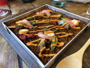 Gioca su una bella cremosità lo Spaghetto al latte di pinoli e sulla pulizia del gusto la pecora cotta alla brace con radicchio, senape, yogurt e olio al lentisco. E, al momento dei dolci curati dal fratello Diego, si uniscono ancora di più culture gastronomiche nella combinazione tra platano, kefir, cioccolato bianco, panela e latte di cocco. Una fotografia della cucina di Orma.