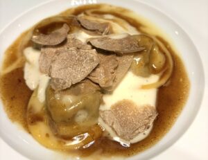 L’Insalata nera e gambero viola, piatto apparentemente semplice, stupisce per l’utilizzo esuberante del crostaceo, nudo e puro, dove grazie a un’orchestrazione dei sapori di fondo riescono ad emergere, quasi fossero una novità, la dolcezza e rotondità dell’ingrediente principale. Nel Risotto curry