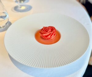 La filosofia culinaria si fonda sulla valorizzazione degli ingredienti locali perduti e riscoperti, come il cavolo trunzu di Aci (una rapa coltivato da sempre nel catanese), con un’attenzione particolare alla sostenibilità e al ritorno alle radici della terra. Una proposta generosa racchiusa nel benvenuto del “Pane e companatico” con due imperiosi carrelli di pani, grissini e lievitati, dove non manca l’iconica “brioscia con tuppo”, qui servita in versione salata, e – il vero momento imperdibile di questa tavola – il Carrello dei vegetali. Si tratta di una sorprendente entrée che gioca con ingredienti vegetali, lavorati come se fossero salumi o formaggi e presentati con originalità e creatività e, appunto, affettati al tavolo davanti gli occhi degli ospiti. Un risultato frutto di grande lavoro e, ad oggi molto in voga tra altri cuochi nazionali – si pensi al lavoro simile, e con medesimi grandi risultati, raggiunto da Giovanni Solofra ai Tre Olivi di Paestum – in grado di stupire e coinvolgere i palati più esigenti, mantenendo sempre una connessione autentica con il territorio.
