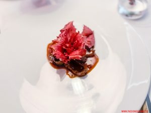 La Pizza Margherita ispira un Raviolo pizza, la Parmigiana è resa “Espressionista” ispirandosi ai “Tagli” di Lucio Fontana, il Risotto 100 si impone subito al palato: diretto, preciso, semplice e complesso insieme. Riuscitissimo il connubio tra la ricciola, magra e nobile, la grassezza del Patanegra e l’amaro dell’asparago cotto al Monolith