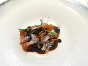 I piatti che si susseguono hanno un numero limitato di ingredienti, con una definizione molto netta di sapori. Si va dalla raffinata interpretazione della tradizione friulana attraverso un omaggio – sostenibile – alla “panada”, zuppa regionale povera e poco nota, in cui una semplice fetta di pane raffermo diventa un piatto sorprendente: viene ammollato prima in un acqua aromatizzata ai semi di finocchio e poi tostato creando un contrasto riuscitissimo croccante-morbido-liquido senza particolari stratagemmi sulle consistenze. Un’intuizione che esalta ingredienti quotidiani, intrecciando memoria, idee e innovazione. Altri colpi d’ala, distinti tra loro nella fermezza dei sapori, sono i Ravioli ripieni di bollito di lingua, sambucoIl sambuco è un genere di piante tradizionalmente ascritto alla famiglia delle Caprifoliacee, che la moderna classificazione filogenetica colloca nella famiglia Adoxaceae. I fiori del sambuco trovano impiego in erboristeria per la loro azione diaforetica. Con i fiori è possibile fare uno sciroppo, da diluire poi con acqua, ottenendo una bevanda dissetante che è molto usata in Tirolo, in Carnia... Leggi, maionese