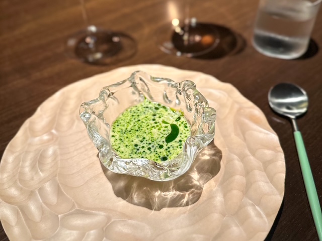 La carta dei vini è vastissima, profonda, costruita con rigore enciclopedico. Un atlante che va dalle grandi etichette francesi ai terroir meno battuti, con un unico filo conduttore: bere bene, senza compromessi. Come nel caso dell’Holy Grail, ossia il pairing dei pairing. Vini unici, bottiglie che di solito non escono da caveau privati, stappate al prezzo di un viaggio (oltre duemila euro). E accanto a questo lusso monolitico, si ritrova un sorprendente pairing analcolico (verso cui è ricaduta la nostra scelta) che contempla una sequenza di fermentati, succhi, infusi, tutti realizzati in cucina che, chiariamolo, non sono affatto un ripiego, ma un percorso parallelo, capace di dialogare con i piatti e di reggere il confronto con il cibo, tanto quanto.