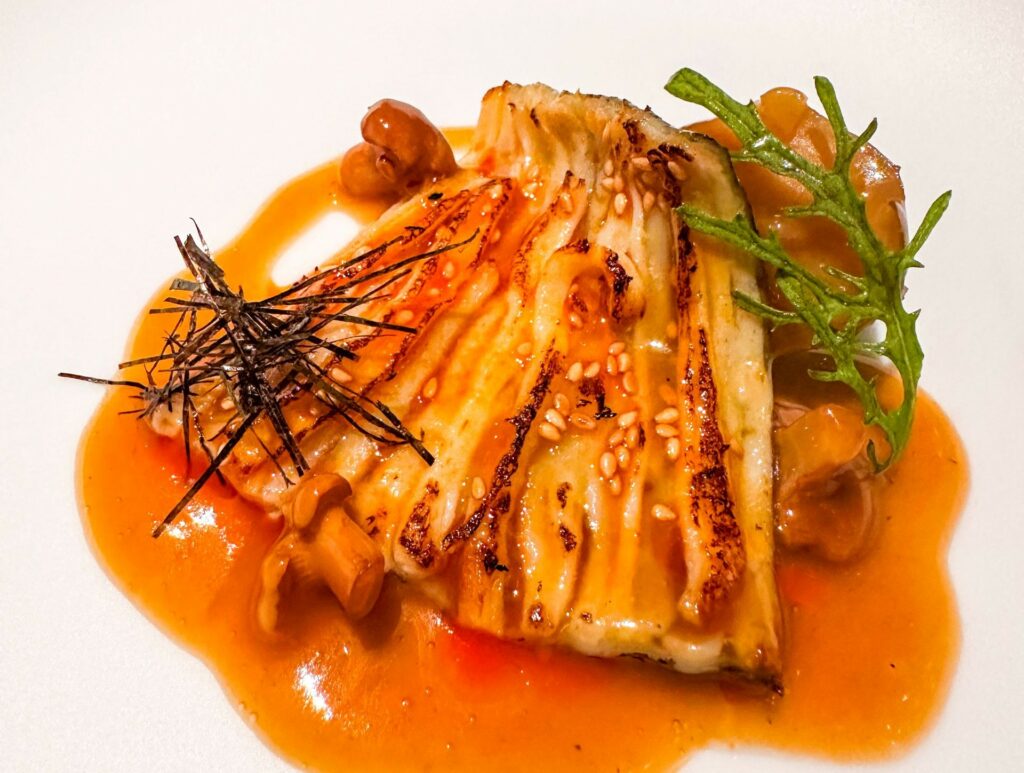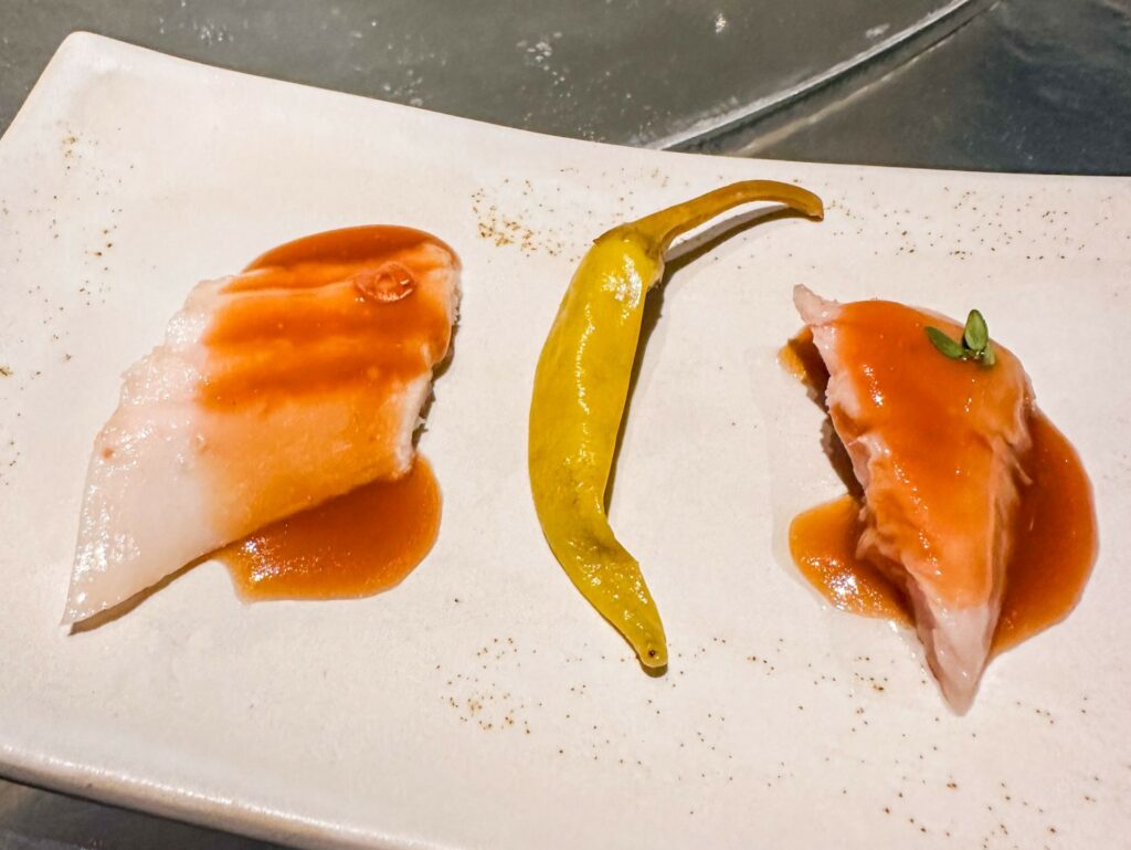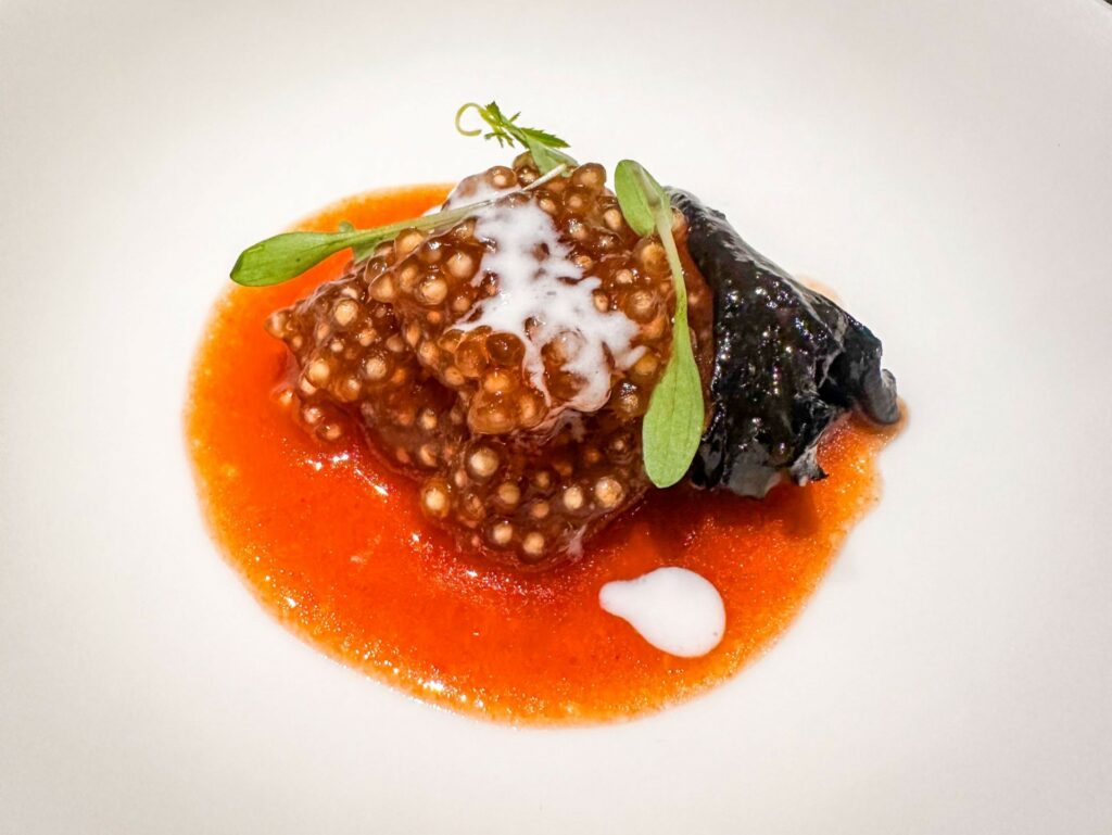 Il menù degustazione attuale ne è un chiaro esempio: una sequenza di piccoli bites in cui la masticazione lascia spazio a consistenze areate e volatili, dando vita a una proposta più vicina a un esercizio di stile che a una cena canonica. Emblematica l’apertura con la Nuvola di mezcalita congelata, un concetto palatale che ridefinisce l’idea stessa di mezcalita – miscela di mezcal e lime – trasformandola in un assaggio dalla texture aerea. Si passa poi alla Mozzarella “quasi” mochi, elastica e calda, che unisce Mediterraneo e Giappone in un unico boccone, ma che solleva anche una riflessione sull’impiego di additivi e tecniche volti a ottenere consistenze particolari, non sempre neutre sul piano della digestione.