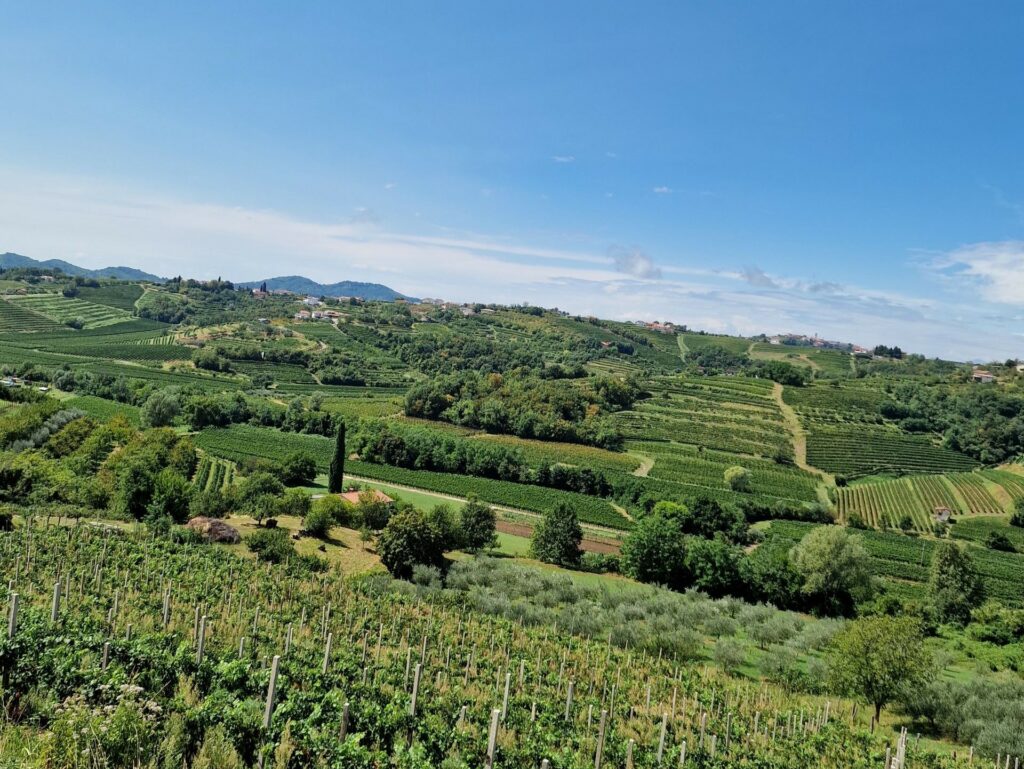 “Dopo due annate complicate, la 2023 che ha avuto un andamento climatico particolare, primavera piovosa, estate molto umida che ha richiesto molto lavoro per tenere lontano peronospora, durante la vendemmia ha iniziato a piovere, inusuale qui da noi. Il Collio è un territorio molto piccolo ma è suddiviso in 3 macroaree climatiche, questa dove siamo noi a Cormòns che è la più calda, la zona più alta di San Floriano e Oslavia e la zona più fredda, quella di Dolegna per la presenza di alcune vallate che non guardano est-ovest ma a Sud, quindi esposizioni diverse e venti più freddi. Questo per dire che noi qui a Cormòns anche nel 2023 siamo arrivati a maturazione piena nonostante l’anno travagliato, con buoni risultati. Il 2024 ha avuto in inizio di stagione molto simile alla 2023, primavera fredda e piovosa, estate esplosa in maniera esponenziale con molto caldo e secco, quindi poca produzione per pianta rispetto alla 2024, e questi stress dovuti al caldo non hanno permesso alle bacche di crescere come al solito, quindi la perdita di quantità rispetto alla 2023 è stata mediamente del 30-35%. La 2025 sembra che sia un’annata buona sia per quantità, qualità delle uve e rese per ettaro, ci eravamo tutti spaventati a giugno, che è stato il più caldo degli ultimi 15 anni, con picchi di 40 gradi, di solito giugno in Friuli è molto piovoso, luglio poi è stato molto piovoso, più del doppio degli ultimi 10 anni, infine agosto e settembre senza particolari problemi che ci portano ad avere in previsione un’annata che sarà da ricordare.”