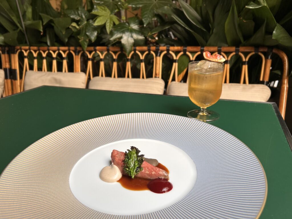 “La struttura del drink è intensa, grazie al Bourbon, ma l’aggiunta dello Champagne ingentilisce l’assaggio. Il filo rosso di questo paring sono i sapori autunnali. Il piccione, con la sua carne succulenta, si sposa bene con la complessità del whisky. Il cacao si intreccia con le note vegetali del fico mentre le note terrose dei funghi e l’acidità dei frutti rossi trovano nel cocktail un contrappunto caldo e avvolgente che rende l’abbinamento armonioso.”
