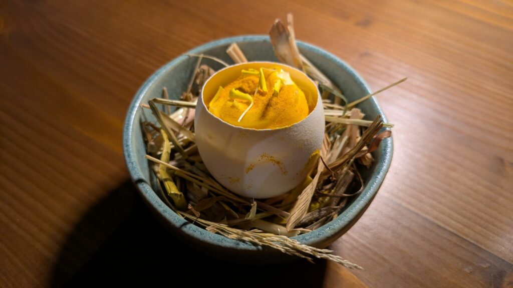 Altra felice prova è il riso di grotta. Un Carnaroli affinato nel ventre tufaceo, con chicchi che assorbono umidità durante il riposo sotterraneo, obbligati poi a cederla in tostatura e a riprenderla in finitura di cottura. Il risultato è un riso con un rilascio amidaceo molto più contenuto del normale, che preserva sia l’identità gustativa del cereale sia la sua struttura. Viene cotto con un brodo di croste di Parmigiano, rifinito con un’estrazione di salvia e rosmarino e con parte delle stesse croste, che nel taglio cesellato si confondono per dimensione con il chicco, senza però mimetizzarsi in sapore. Chiude il piatto la polvere di verdure alla brace, amaricante, e la pasta di limone, acido-dolce. Il risultato è un riso dalla consistenza plastica, dal morso deciso e non accomodante, con profondità balsamica ed equilibrio fra la dolcezza del formaggio e la vibrazione agrumata. Forse il piatto che meglio racconta l’idea di “fare con tatto”: accompagnare un ingrediente verso un’espressione ulteriore senza cancellarne l’identità.