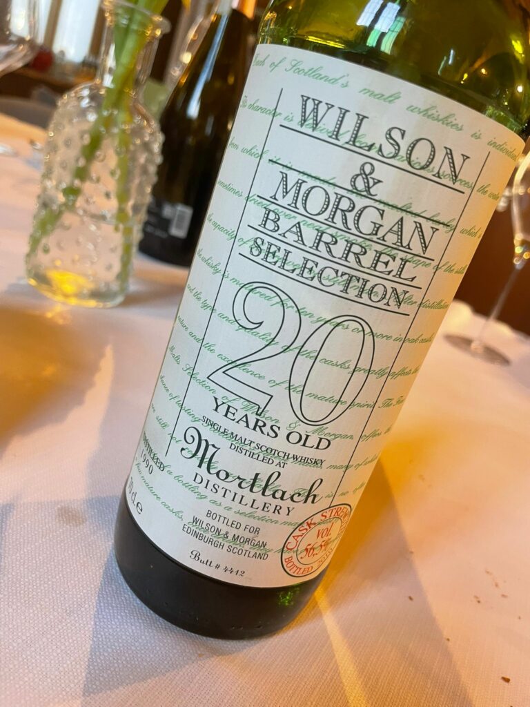 Per gli amanti dei distillati non può mancare in tavola il Wilson & Morgan, un Mortlach di 20 anni. Maturo e potente, con affascinante contrasto tra naso e palato. Naso complesso e intrigante: sherry terroso, prugna succosa, arancia vivace, quercia speziata, olio d’oliva e accenti mentolati. Sorso dolce in apertura su frutta e prugna, poi tannini robusti e spezie esplosive. Finale lungo, asciutto, speziato e affumicato.